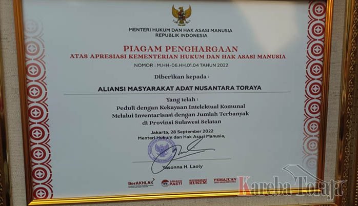Penghargaan dari Menteri Hukum dan HAM ini diterima oleh Ketua Aliansi Masyarakat Adat Nusantara Toraya (AMAN Toraya), Romba Marannu Sombolinggi’, selaku Kustodian.