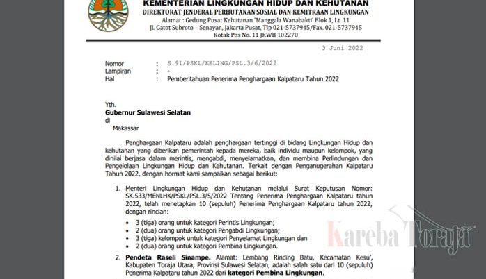 Melalui surat nomor S.91/PSKL/KELING/PSL.3/6/2022 Kementerian Lingkungan Hidup dan Kehutanan Republik Indonesia memberitahukan bahwa Menteri Lingkungan Hidup dan Kehutanan Republik Indonesia melalui Surat Keputusan Nomor SK.533/MENLHK/PSKL/PSL.3/5/2022 tentang Penerimaan Penghargaan Kalpataru tahun 2022 telah menetapkan 10 penerima Penghargaan Kalpataru tahun 2022, dengan rincian 3 orang kategori Perintis Lingkungan, 2 orang kategori Pengabdi Lingkungan, 3 kelompok untuk kategori Penyelamat Lingkungan dan 2 orang kategori Pembina Lingkungan.