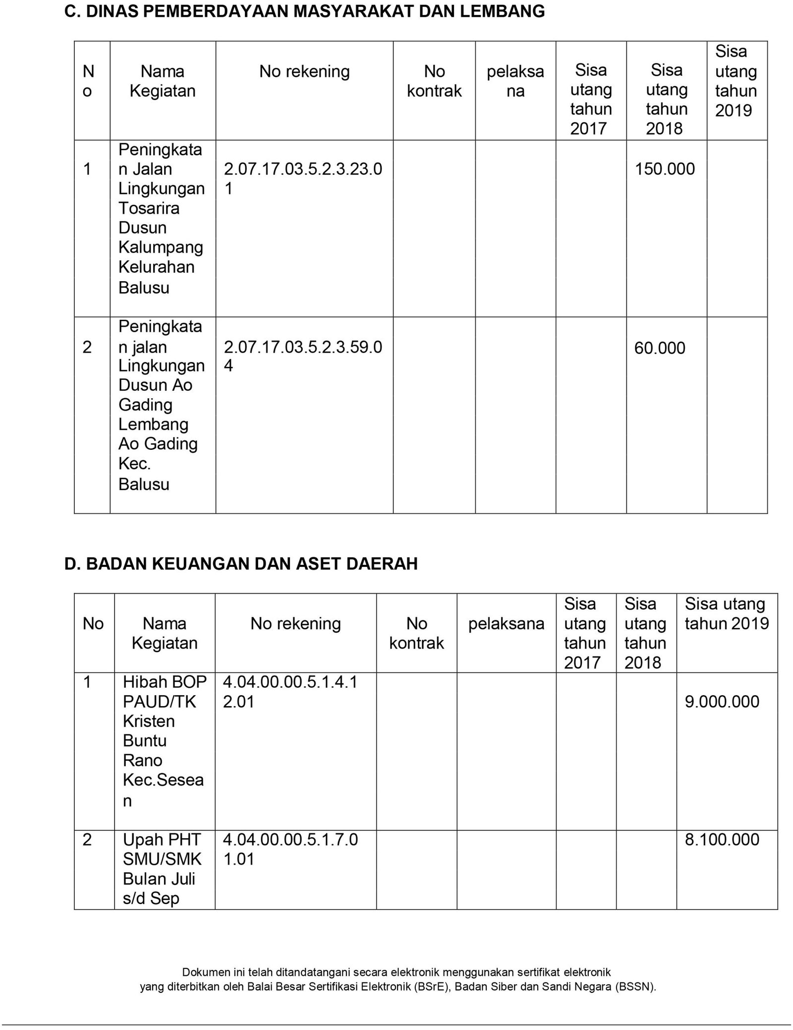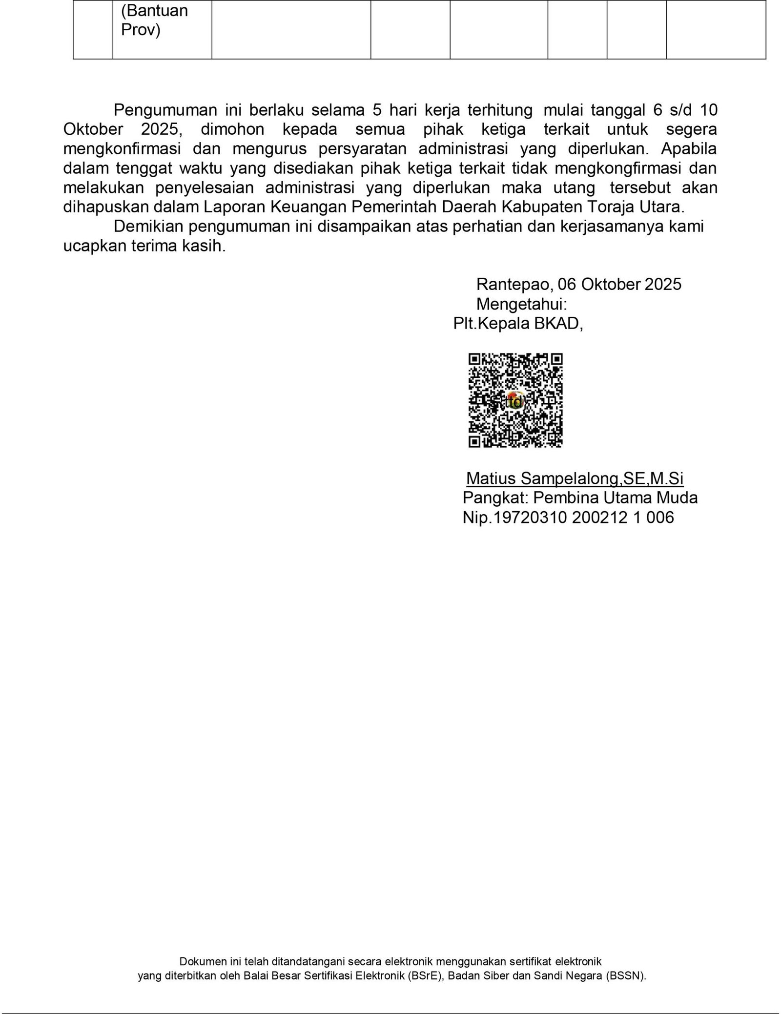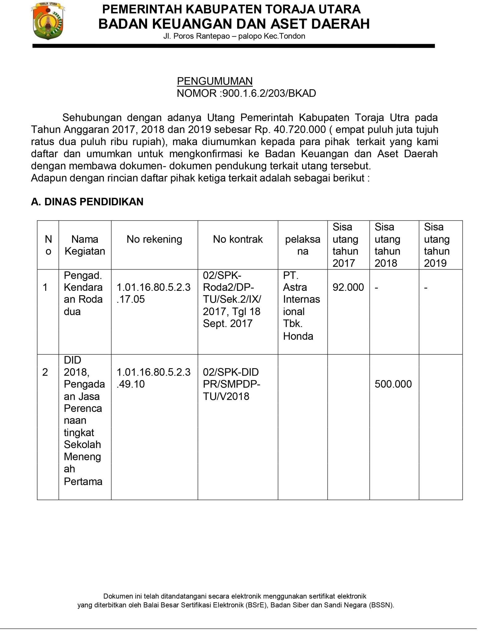 PENGUMUMAN BADAN KEUANGAN DAN ASET DAERAH KABUPATEN TORAJA UTARA
